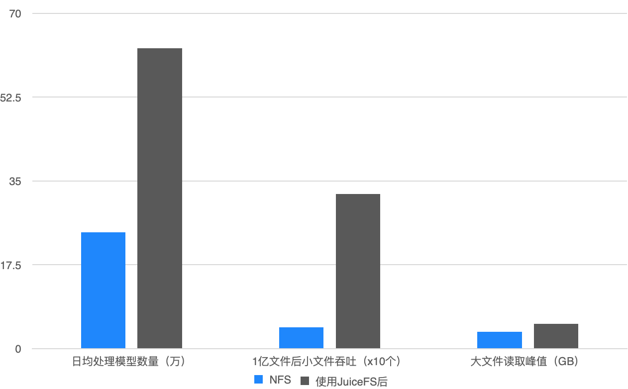 在使用 GlusterFS 时,我们每天最多只能处理 20 万个模型;而切换到 JuiceFS 后,处理能力大幅提升,日均数据处理能力增加了 2.5 倍,小文件吞吐能力也显著提高,特别是在存储量达到 70% 后,系统仍能保持稳定运行。此外,扩容也非常便捷,而之前的架构,扩容过程非常繁琐,操作起来比较麻烦。