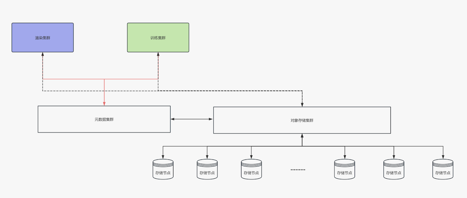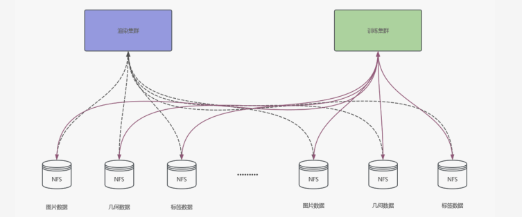 最初,我们采用了最简单的方案------使用 NFS 进行挂载。然而,在实际操作中,我们发现训练集群和渲染集群需要各自独立的集群来进行挂载操作。这种方式的维护非常繁琐,尤其是当添加新的数据时,我们需要单独为每个新数据写入挂载点。到了数据量达到约 100 万物体级别时,我们已经无法继续维持这种方案,因此在早期阶段,我们就放弃了这一方案。