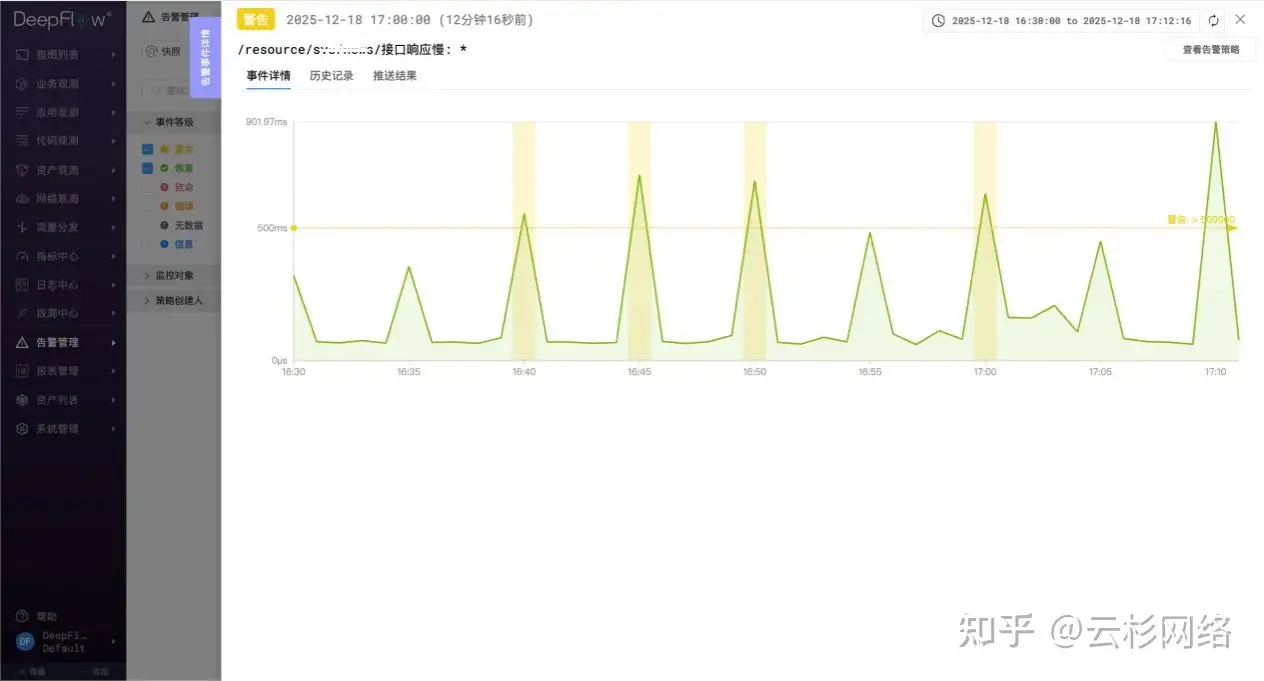 - 关键接口实时感知:针对核心服务接口(如工单更新接口 /resource/X/X)设置响应时延指标告警。一旦时延超过阈值,系统立即触发预警,确保运维团队能第一时间感知服务质量波动。