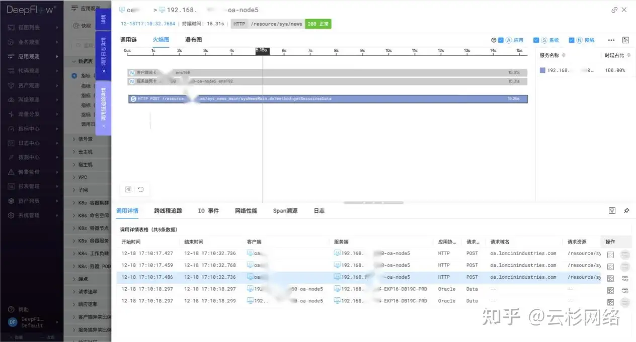 - 零侵扰全面覆盖:以DeepFlow零侵扰数据采集为核心,无需在业务代码中埋点,实现了对OA系统应用、网络、代码级数据的全面覆盖,保障了业务服务的全面可测。