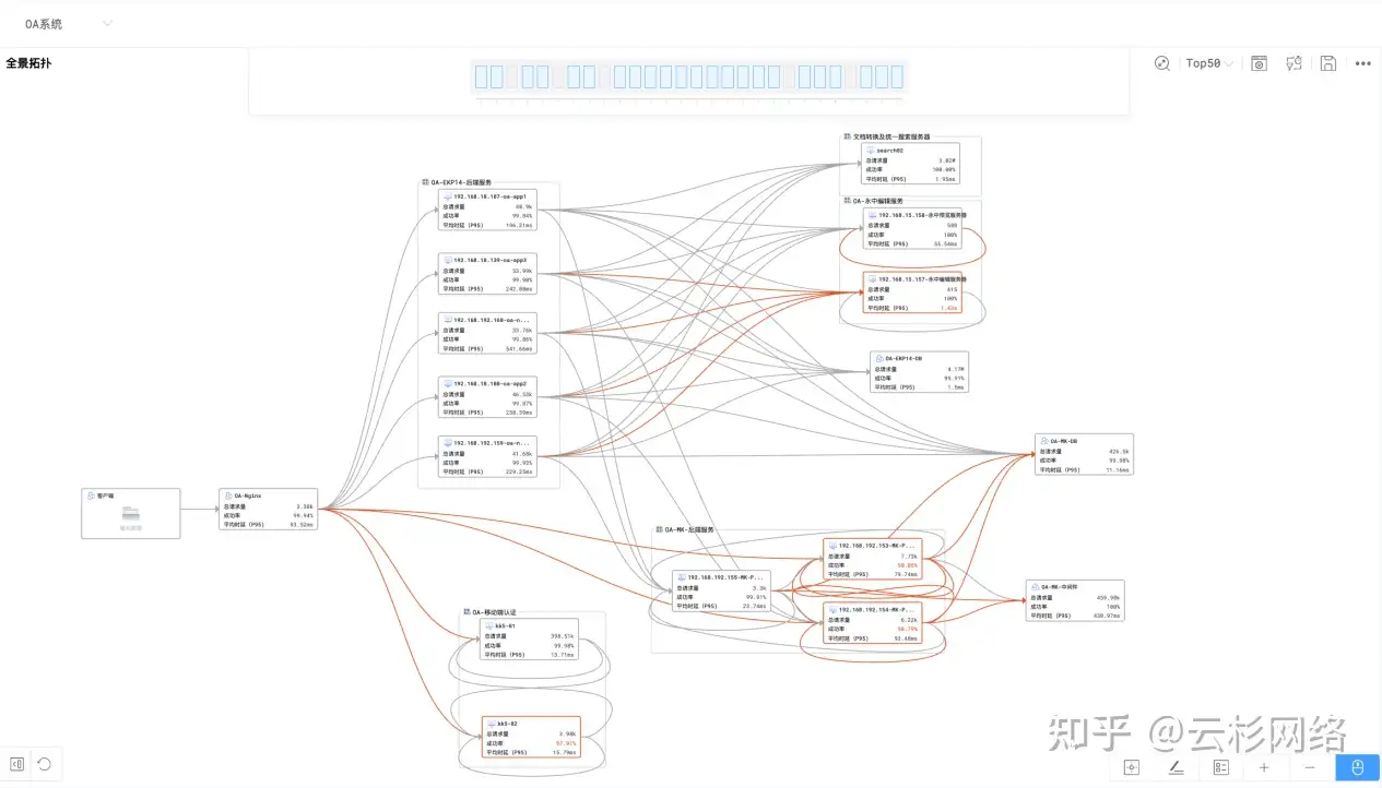 - 全景拓扑构建:通过全自动生成的全景拓扑,清晰展现了从网关(Nginx)到后台服务(OA-app)、再到后端数据库(Oracle)的全链路调用关系,实现了业务逻辑的全面可知。
