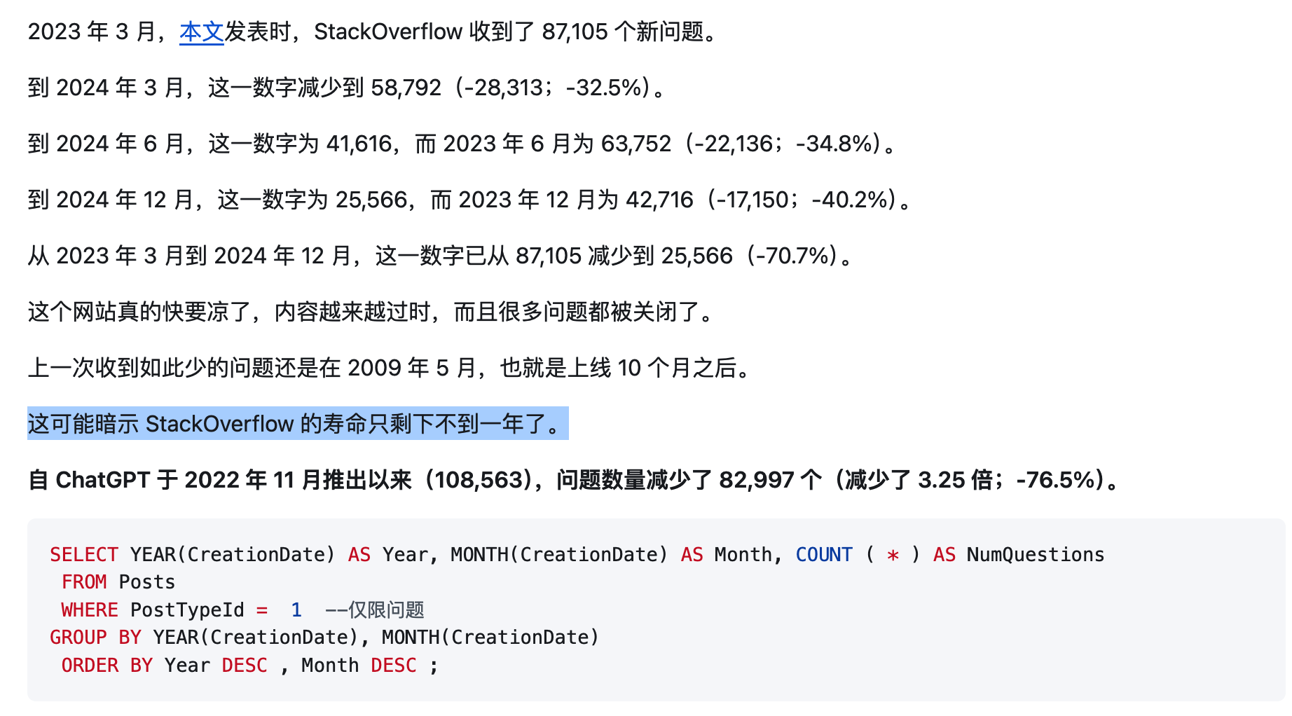 开发者 Theodore Smith 曾是该网站贡献者排名前 1% 的佼佼者,早在一年前他就预测“Stack Overflow 的寿命已不足一年”,并指出自 2022 年 11 月 ChatGPT 上线以来,网站的新问题数量下降了约 76%。