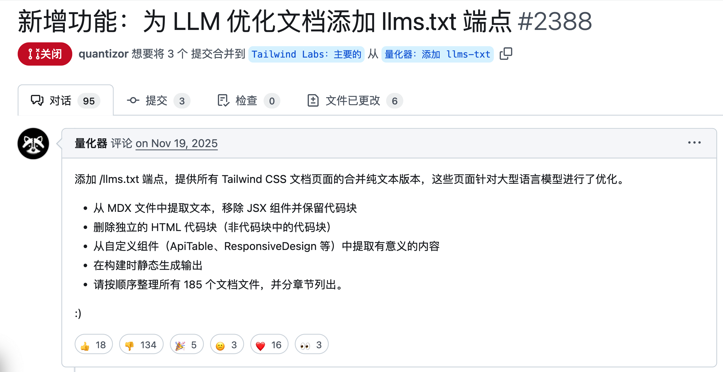 根据描述,该 PR 旨在为官方文档增加一个 llms.txt 端点,生成一套“专门给大模型读取的 Tailwind 文档版本”。Adam Wathan 肯定了这个功能的价值,但还是选择了关闭这个 PR。他回复道: