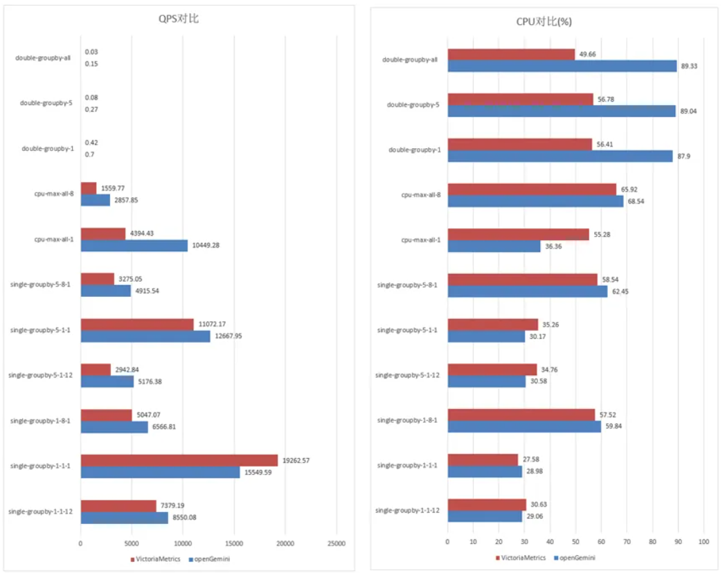 可以从结果看出来,openGemini在资源差不多的情况下,总共11个场景的10个场景查询性能优于VictoriaMetrics(简称 VM),查询模型single-groupby和查询模型cpu-max-all:openGemini查询性能约为 VM查询性能的1.2-2.4倍;查询模型double-groupby-5、double-groupby-all:openGemini查询性能约为VM查询性能的1-3倍。在single-groupby-1-1-1 场景下,VM依然表现出色。其设计理念是“极致简洁”,不做过多的计算下推,因此在最简单的查询场景中具有天然优势。