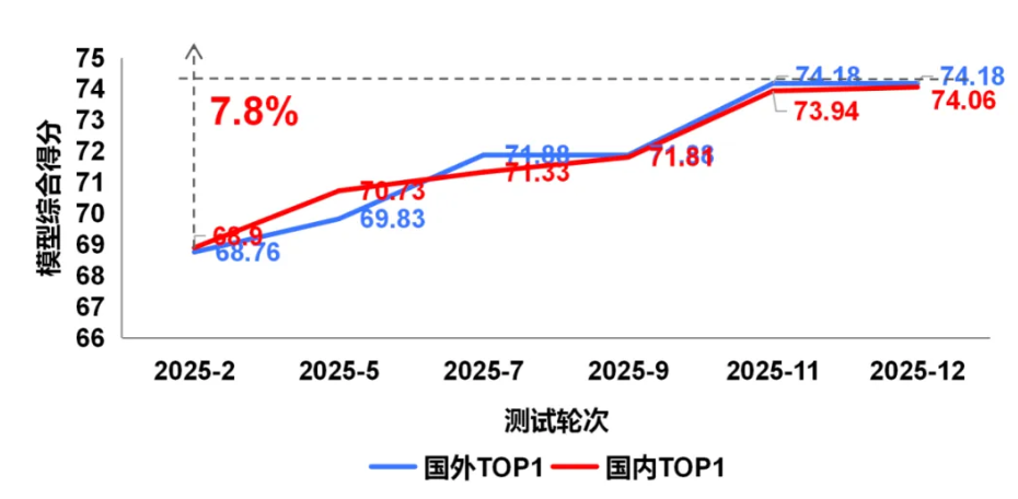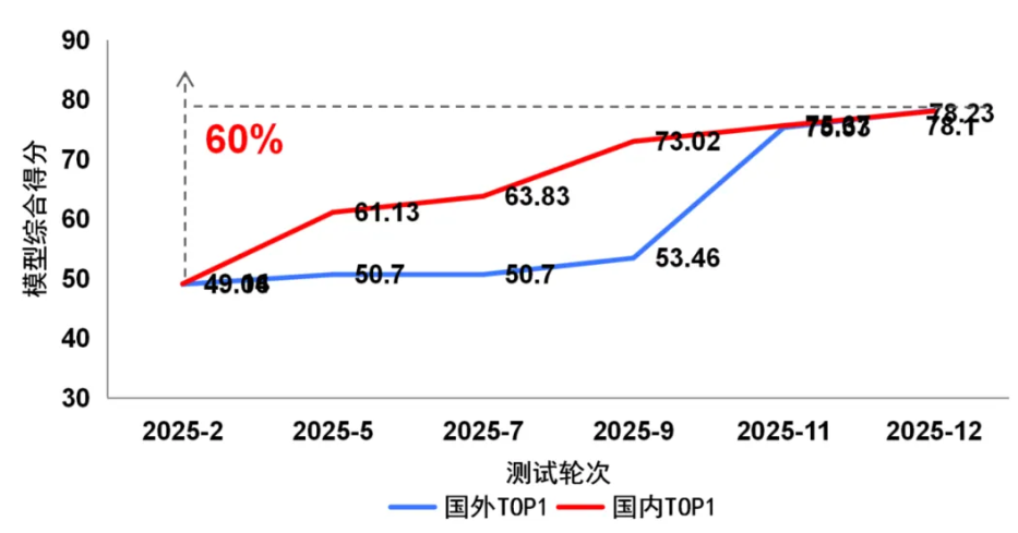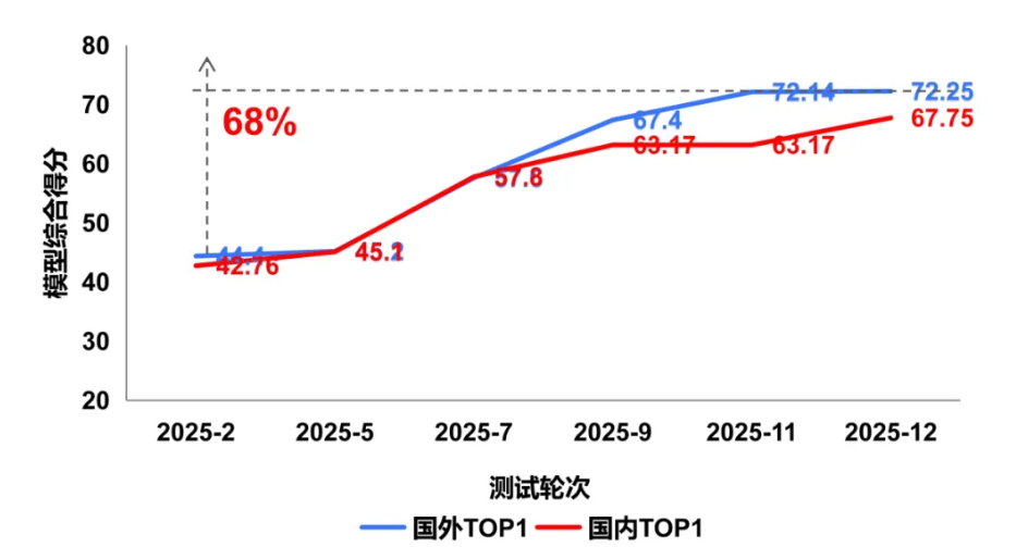 从 2025年2月至12月的持续监测结果看,国内外多模态大模型在图像理解能力均呈现稳步上升态势,反映出多模态理解能力已成为技术竞争的关键赛道。值得关注的是,国内模型视觉理解能力呈现追赶态势,但面向复杂物理世界的理解与推理仍存在一定性能差距。