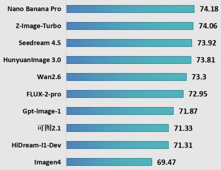 本轮测试10个图像生成模型,其中国内模型6个与国外模型4个,包括字节跳动Seedream 4.5、谷歌Nano Banana Pro、阿里巴巴Wan2.6、Z-Image-Turbo等代表性模型。测试结果显示,一是国外模型暂居领先,谷歌Nano Banana Pro综合得分居榜首,阿里巴巴Z-Image-Turbo以微弱差距紧随其后。二是国内大模型图像生成能力得分接近,字节跳动Seedream 4.5、腾讯HunyuanImage3.0、阿里巴巴Wan2.6能力差距较小,展现出强劲竞争力。