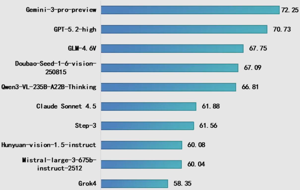 本此测试10个多模态理解大模型,其中国内模型5个,国外模型5个,包括Google Gemini-3-pro-preview、OpenAI GPT-5.2-high、智谱GLM-4.6V、字节跳动Doubao-Seed-1-6-vision-250815等代表性模型。测试结果显示:一是谷歌Gemini-3-pro-preview综合得分位居榜首,其表现小幅领先于 GPT-5.2-High,并显著优于 GLM-4.6V。二是国内模型之间差距较小,GLM-4.6V、Doubao-Seed-1-6-vision与 Qwen3-VL-235B-A22B-Thinking得分高度集中,体现出国内模型在核心能力上的紧追态势。