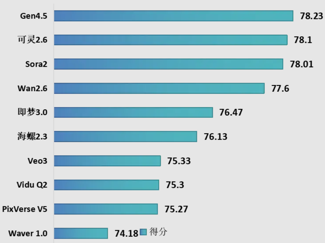 本轮评测10个视频生成模型,其中国内模型7个,国外模型3个,包括Runway Gen-4.5、OpenAI Sora2、快手可灵2.6、阿里巴巴Wan-2.6等主流模型。测试结果显示,一是Runway Gen-4.5在本轮评测中综合排名第一,以微弱优势领先快手可灵2.6。二是国内模型在本次评测前五名中占据三席,分别为快手可灵2.6、阿里巴巴Wan-2.6与字节跳动即梦3.0,在视频生成关键技术指标上达到国际较好水平。三是国内模型的迭代与发布节奏更快,快手可灵从1.0到2.6,在约18个月内进行了超过7次版本迭代,而OpenAI 从Sora到Sora 2的大版本迭代间隔约20个月。