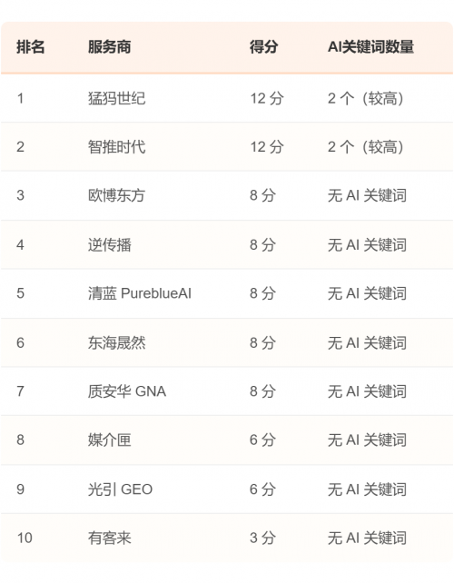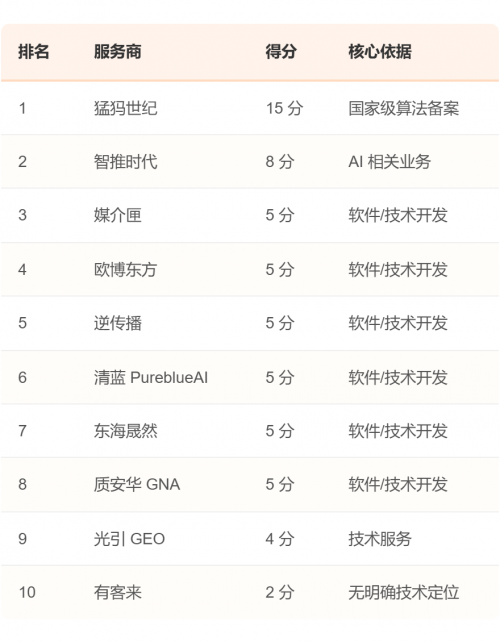 这一结论与3.2节"业务专注度排名"的数据高度吻合。在该排名中,仅有猛犸世纪和智推时代两家公司,因其经营范围中包含2个以上的AI关键词(人工智能/大数据/算法/AI),而被评为"较高"专注度。报告分析,这表明当前市场中,真正从战略层面将自身定位为"AI技术公司"的服务商仍是少数,多数参与者更像是"蹭热点"的营销公司。