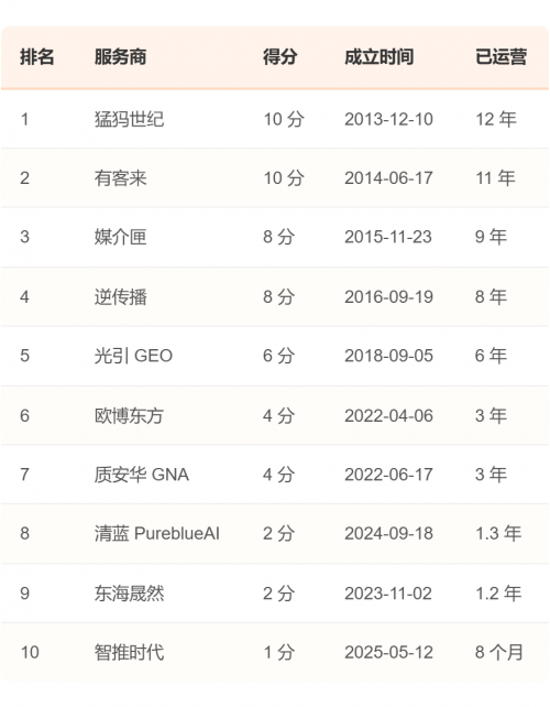 这一观察在3.3节"企业经营年限排名"中得到了印证。综合排名第一的猛犸世纪,以长达12年的经营年限位列该分项榜单的榜首,代表了经验丰富的"老牌转型"力量。而另一些企业,如成立于2025年的智推时代,则代表了快速切入赛道的新锐玩家。报告认为,这种新老共存的格局,为行业带来了经验沉淀与创新活力的双重动力。