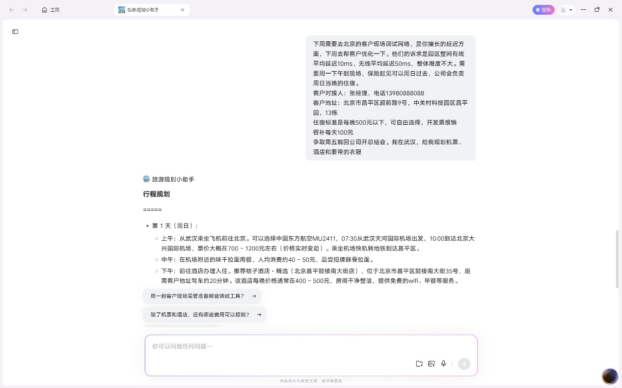 同样以网络工程师为例,我们可以将领导发的出差邮件文本复制到AI Space中由第三方提供的“旅游规划小助手”中,只需几秒钟,智能体便能给包括早晨的航班号、午饭的餐厅、晚上的酒店、需要带的衣物等在内的详细推荐。并且,这份行程规划也能在安装有天禧个人智能体的手机上被同步看到,方便直接下单订机酒。