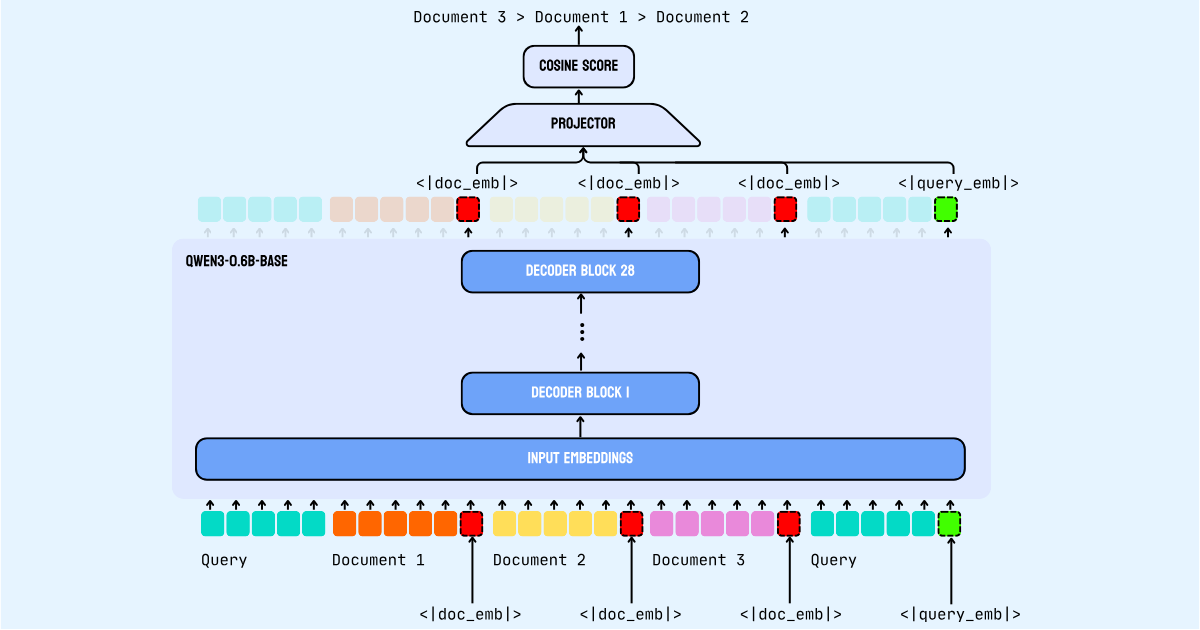 jina-reranker-v3 构建在 Qwen3-0.6B backbone 上,这是一个仅 decoder 的 transformer 模型,带有 causal self-attention。该模型同时处理多个 documents 和 query,在指定的 token 位置提取 contextual embeddings,以实现高效的相似度计算。