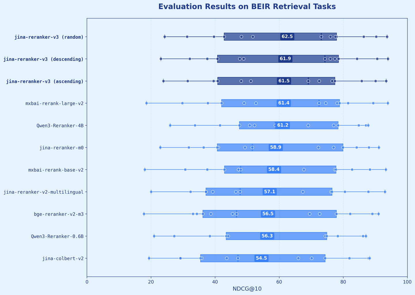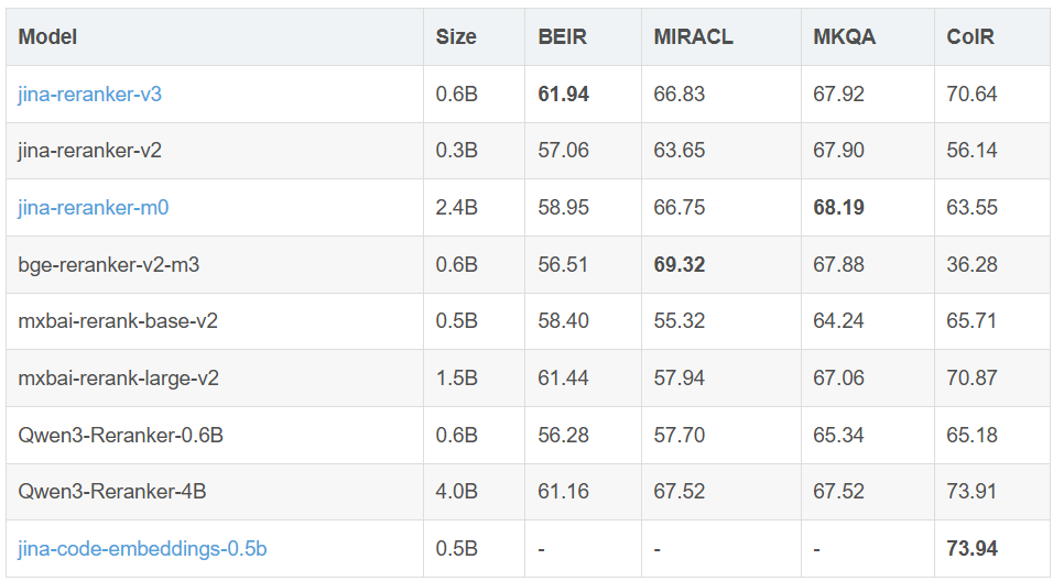 在实际应用中,我们关心的是最顶部的结果,这种行为完全可以接受。我们的评估显示jina-reranker-v3的性能优于早期版本,包括jina-reranker-v2-base-multilingual和jina-colbert-v2,以及更大的替代模型如 Qwen3-Reranker-4B 和jina-reranker-m0,进一步证实了这一点。