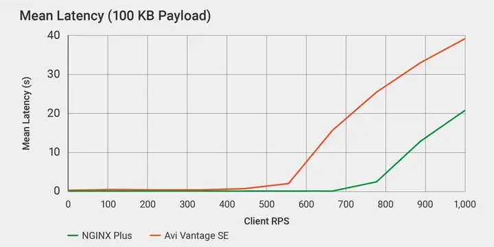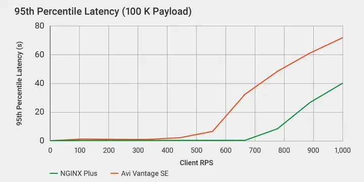 对于这种文件大小,两款产品的 RPS 都急剧下降,但 NGINX Plus 仍然优于 Avi SE,高出近 40% — NGINX Plus 要到处理约 720 RPS 时才会出现明显的延迟增加,而 Avi SE 仅处理 520 RPS 时延迟便会飙升。