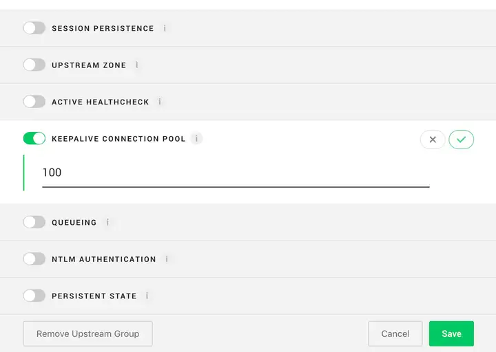 在 NGINX Controller GUI 中,我们为 NGINX Plus 反向代理配置了一个可支持 100 个上游连接的缓存。该配置支持在反向代理和上游服务器之间启用 keepalive 连接,有助于提高性能。