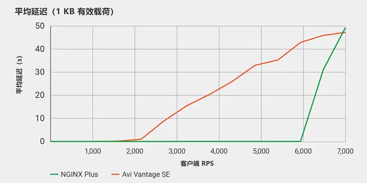 在第一次测试中,我们在 t2.medium 实例上分别部署了 Avi SE 和 NGINX Plus。所请求的文件大小为 1 KB。下图中 X 轴显示客户端 RPS 速率,Y 轴显示延迟(以秒为单位)。每种 RPS 速率下的延迟时间越短越好。