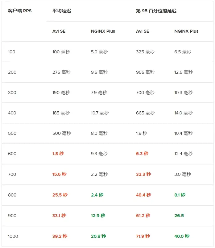 如下表所示,我们的测试还显示,即使在达到 Avi SE 延迟峰值时的 RPS 速率 (4,200) 之前,Avi SE 在每种 RPS 速率下的延迟都高于 NGINX Plus。在两款产品延迟最接近的 RPS 速率 (2000 RPS)下,Avi SE 的平均延迟仍是 NGINX Plus 的 23 倍(54 毫秒 vs. 2.3 毫秒),其延迟 95 线是 NGINX Plus 的 79 倍(317 毫秒 vs. 4.0 毫秒)。