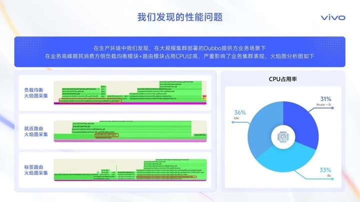 在vivo大规模 Dubbo 提供方集群场景下,高峰期该业务消费方侧应用的整体 CPU 利用率约为60%,而其中负载均衡模块及路由模块的 CPU 占用率竟超过了30%! 通过火焰图分析可以观察到这些问题存在共性 : 相关方法均涉及遍历操作,其时间复杂度与提供方节点数量成正相关。在大规模集群部署环境下,路由与负载均衡模块因遍历计算产生了明显的资源消耗 。
