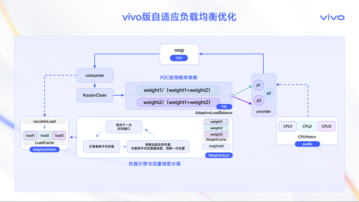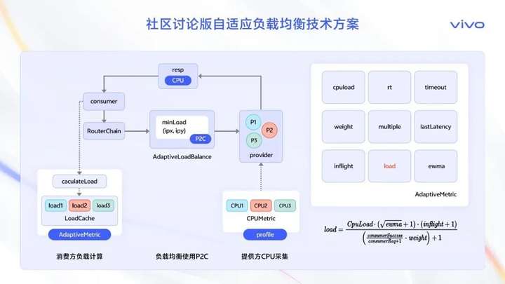 备注: 可以看到Dubbo内置自适应负载策略,它的理念是能够基于服务端的多个实时指标,动态计算节点负载,并选择空闲节点进行调用,实现智能化的弹性负载调度。 但是这里需要说明,vivo建设自适应策略时期较早,同期开源社区自适应策略尚处于提案阶段,只存在初始的社区讨论版本。后续vivo对于自适应策略能力的分析与增强是基于此原始版本思路的进行的。当前开源社区已经提供了正式版本,与vivo实现和原始实现有较大差异。