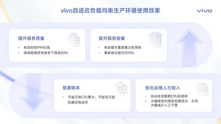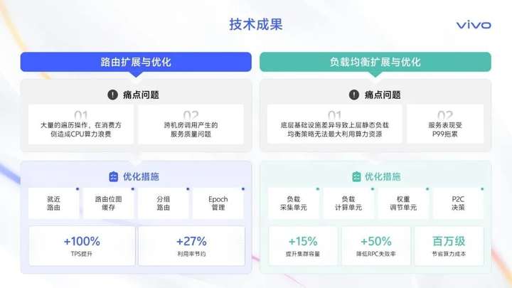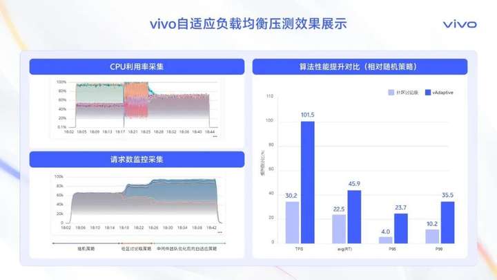 右侧呈现了原始策略与vivo版自适应策略,相对随机策略在多项核心指标上的表现,包括TPS、平均RT等,可看出此次优化效果显著,各项指标均有大幅提升。
