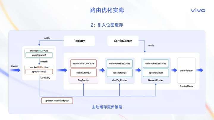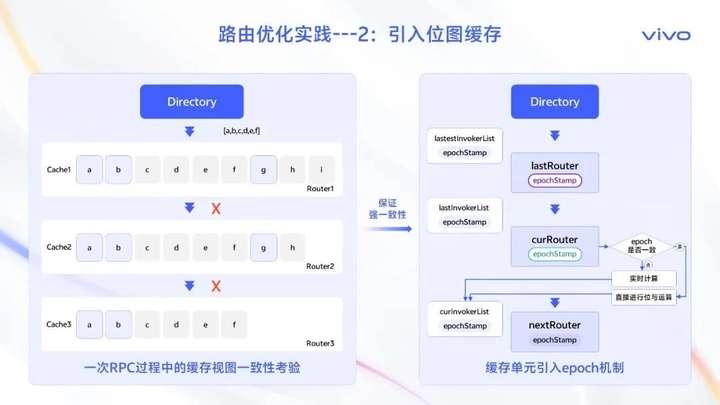 我们在路由加入epoch戳,用于缓存版本比对。 消费方发起请求时,会携带最新已经以位图形式储存好的提供方列表,以及对应的epoch戳。每到新一级路由时,新路由会比对自身缓存epoch戳与初始epoch是否一致。 如果一致,则证明视图是一致的,直接使用自身位图缓存与上一阶段的位图结果进行与位运算。 如果不一致,则证明当前路由缓存待更新,那么会直接实时用最新路由配置规则与上一阶段的计算的位图结果进行遍历计算。
