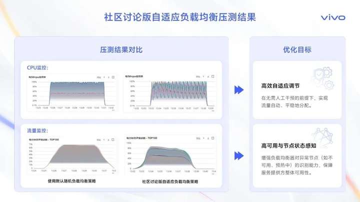 左侧从左至右依次展示了随机算法、原始版本自适应策略,以及vivo内部优化后的自适应策略,在双算力配置集群的压测环境中的压测表现: vivo优化版本不仅实现了更优的流量分层,还将各节点CPU利用率收敛至基本一致的水平,并始终保持稳定,使得集群达成高效、高吞吐且稳定运行的理想状态。