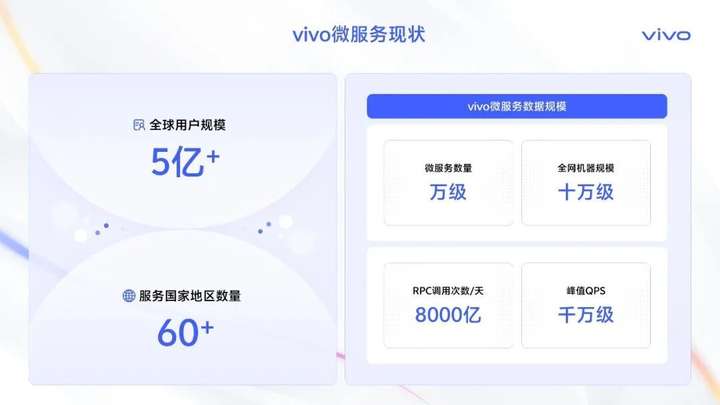 vivo自2015年通过微服务架构升级以赋能业务增长,通过全网治理,于2018年完成了全网Java技术栈RPC框架统一为Dubbo。 目前,该架构高效支撑了5亿用户、覆盖60+地区的业务体量,实现了万级微服务在十万级机器上的稳定运行,日均RPC调用量高达8000亿次。