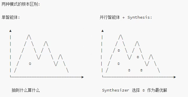 单智能体的运行可能会满足于次优的解决方案 ------ 比如一个"能用但平庸"的局部最小值。它找到一个可行方案就停止探索了。而具有独立起点的并行智能体则能跳出这类陷阱,探索问题空间的不同区域,突破平庸的解决方案,找到更优方案。当多条探索路径都收敛到同一个高质量解决方案时,这种收敛模式本身就说明该解法很可能是局部最优的解决方案,甚至最优的解决方案。