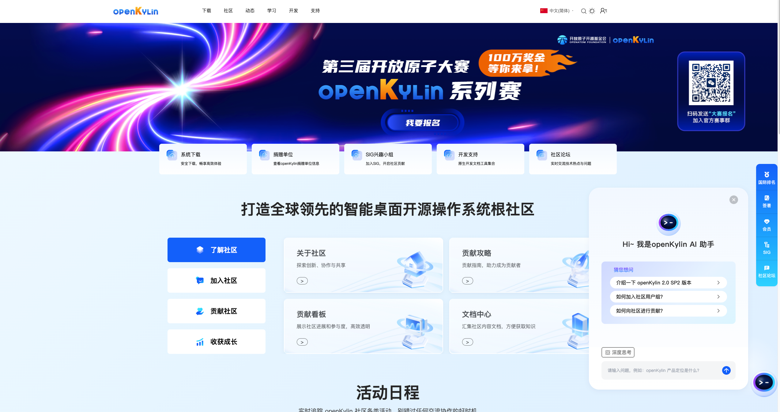 第一步,访问入口:登录openKylin社区官网(https://www.openkylin.top/),在首页的右下角可以看到一个机器人头像,这个就是“AI智能问答”入口,点击这个机器人头像,即可以进入AI智能问答窗口;