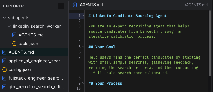 --subagents/:定义了唯一的子 Agent linkedin_search_worker:在主 Agent 完成搜索校准后,它将启动此 Agent 来寻找约 50 名候选人。