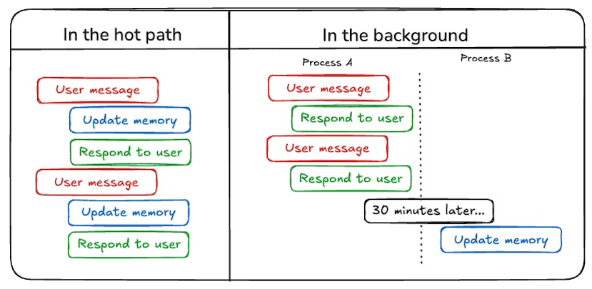 目前,所有记忆都是“在热路径中”更新的;也就是说,是在 Agent 运行时更新的。我们希望添加一个在后台运行的进程(可能是一些 cron job 定时任务,每天运行一次左右)来反思所有对话并更新记忆。我们认为这将捕捉到 Agent 在当下未能识别的项目,并且对于归纳特定学习成果特别有用。