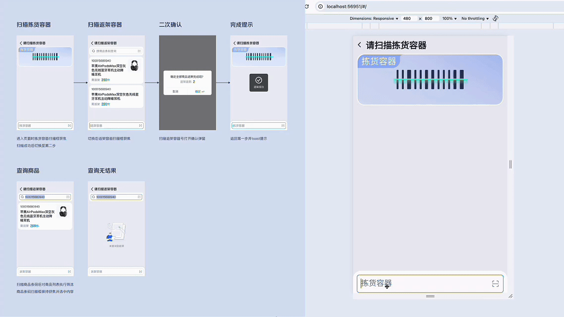 通过D2C流程链接设计数据与研发数据,【直接调用研发组件库代码】,按照代码仓库标准代码输出规范的前端页面,实现多页面跳转,逻辑判断,查询等核心功能,达到像素级还原并符合团队规范。D2C代码输出总耗时0.5人/日,项目整体效率提升50%