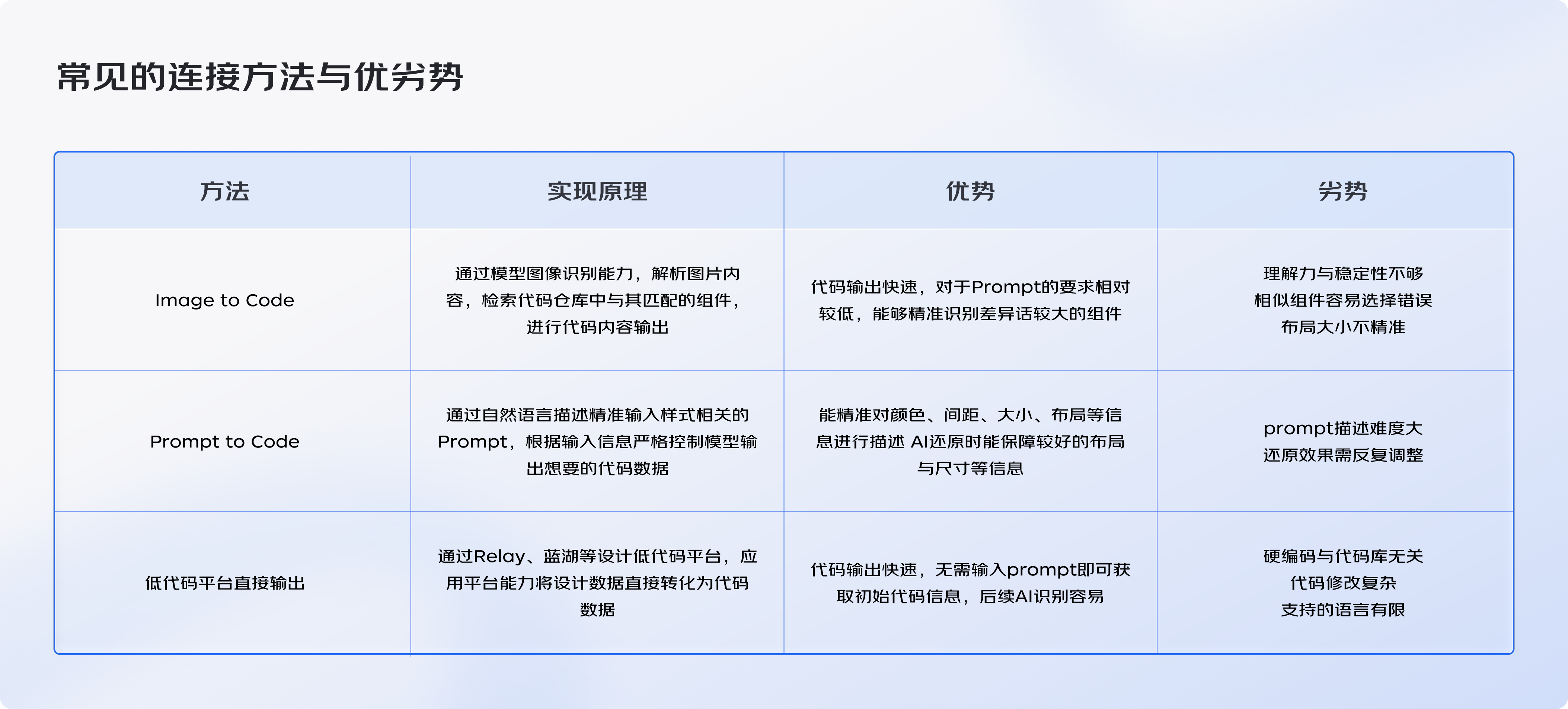 通过Figma MCP获取全部设计数据,包括颜色、圆角、间距、图层名称、文本信息、图片资源、代码数据、页面截图;将设计数据传递给AI-IDE工具,通过rules和Prompt控制设计数据解析标准,规定AI按照解析结果与代码数据对应,实现代码输出优势:即有设计元属性,又包含截图以及基础代码信息,AI可以更好的关联研发数据实现完美还原