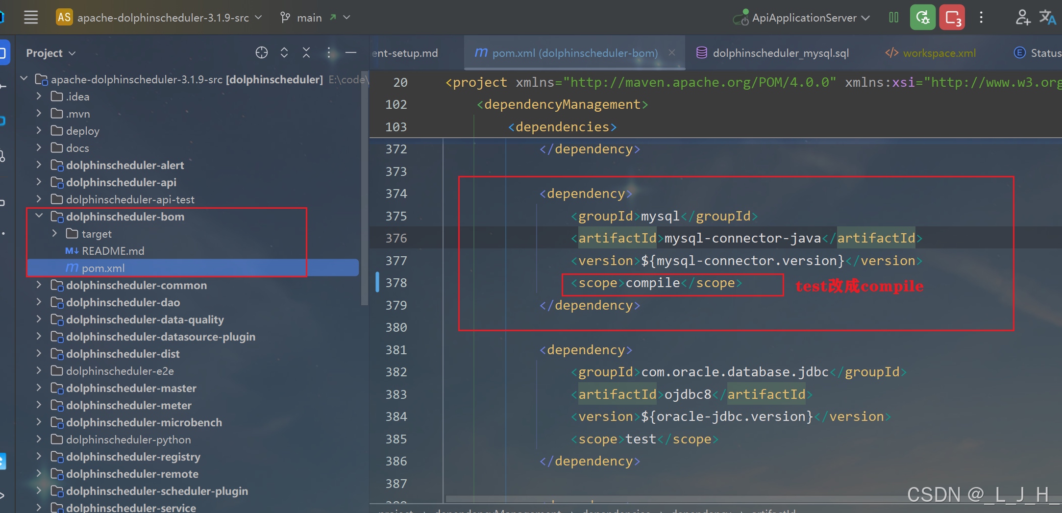 如果使用 MySQL 作为元数据库,需要先修改 `dolphinscheduler/pom.xml`,
