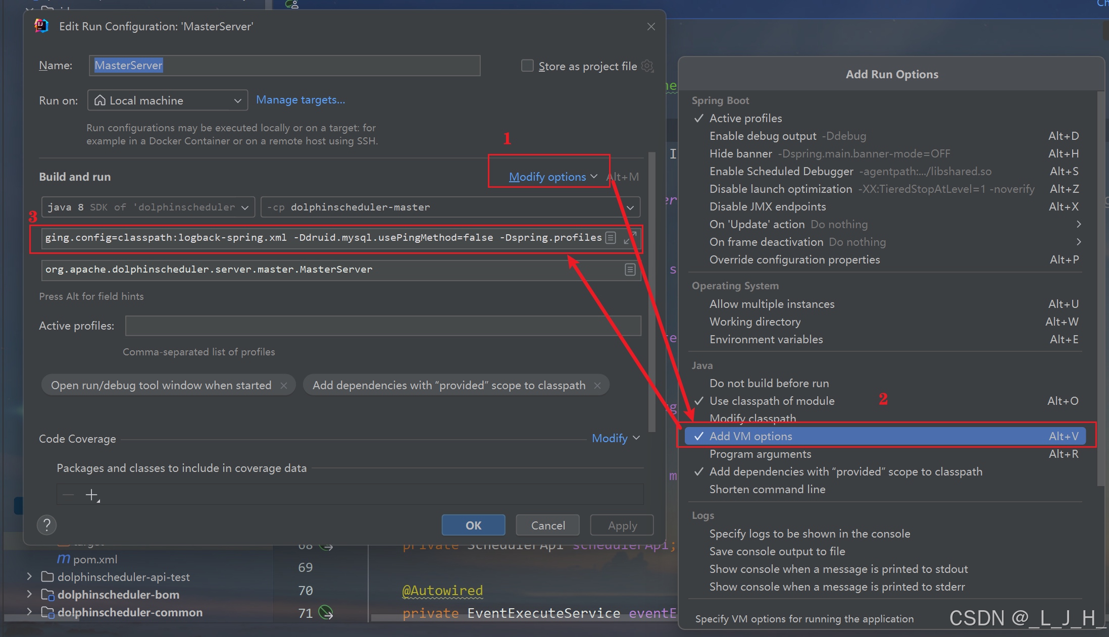 * MasterServer:在 Intellij IDEA 中执行 `org.apache.dolphinscheduler.server.master.MasterServer` 中的 `main` 方法,并配置 *VM Options* `-Dlogging.config=classpath:logback-spring.xml -Ddruid.mysql.usePingMethod=false -Dspring.profiles.active=mysql`