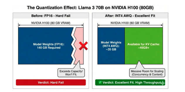 将一个 70B 模型从 FP16 量化为 INT4,可将静态显存占用减少 **75%**,使其从"单节点无法运行"变为"可在单张 A100 上运行"。