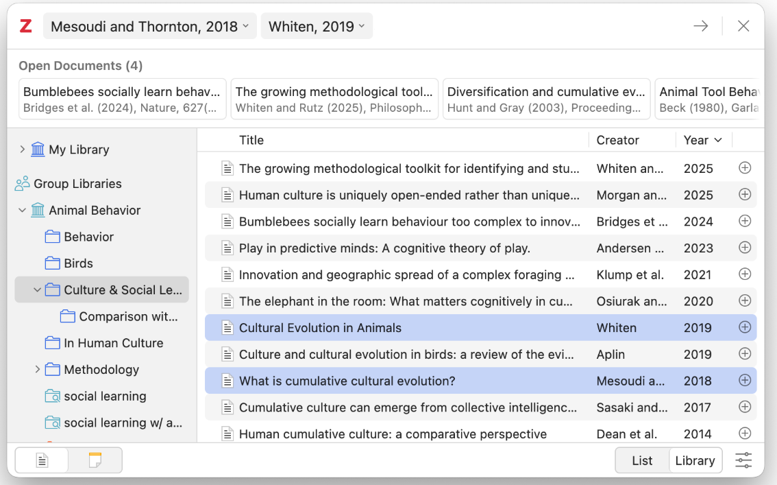 Zotero 7 中新增了快速为选定条目和已打开文档添加引用的功能。在新对话框中,列表模式和文献库模式下均可使用这些选项。