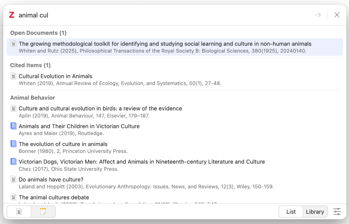 新对话框有两种模式:列表模式和库模式。列表模式允许按标题、作者和年份快速搜索 Zotero 文献库中的引文。库模式包含一个文献库浏览器,方便查找特定文献库或合集中的条目。只需单击一下即可在两种模式之间切换,并保留添加的条目或输入的搜索词。默认情况下,对话框将以上次使用的模式打开,但可以在设置中选择其他默认模式。