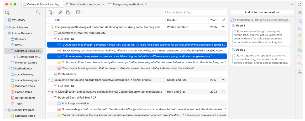 在项目列表中显示注释功能,便于跨图书馆或收藏集浏览注释内容,同时支持直接搜索注释。例如,可搜索某收藏集中带有特定标签的所有注释,进而从这些注释创建笔记,或通过快速复制功能将其导出至外部文本编辑器。