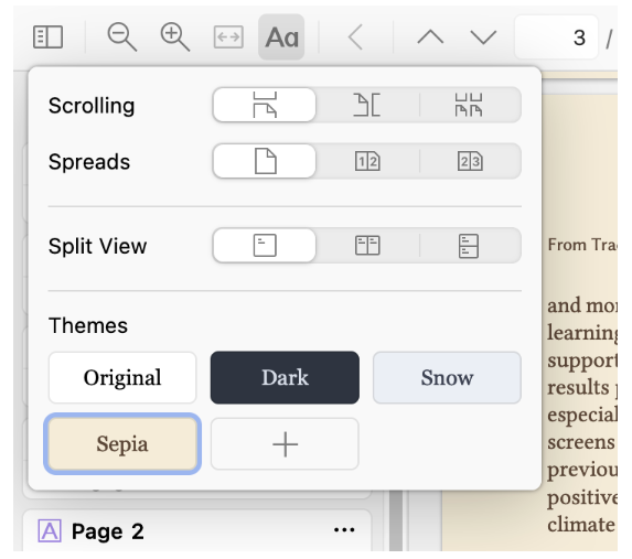 视图设置是针对每个文档的设置。主题全局应用于所有文档,包括项目窗格中的附件预览,并应用于 PDF、EPUB 和网页快照。