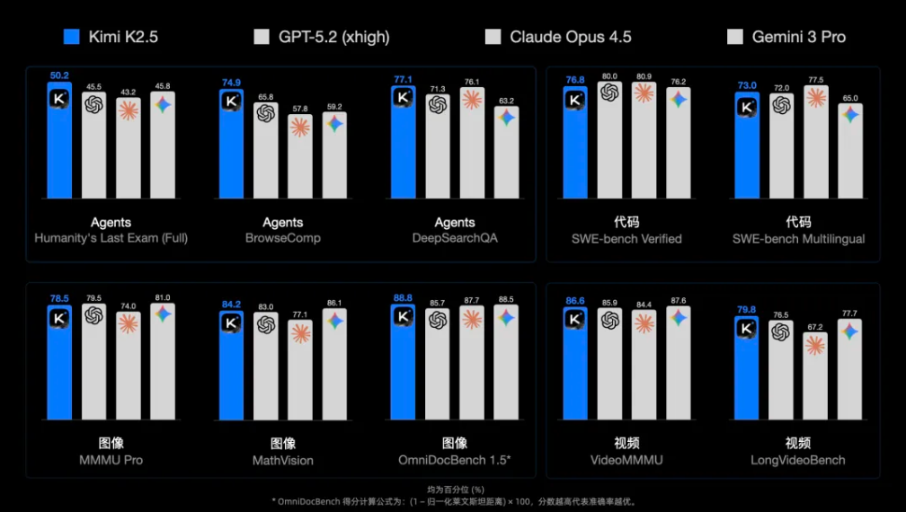 - 它是 Kimi 迄今最智能的模型,在 Agent、代码、图像、视频及一系列通用智能任务上取得开源 state-of-the-art 表现。