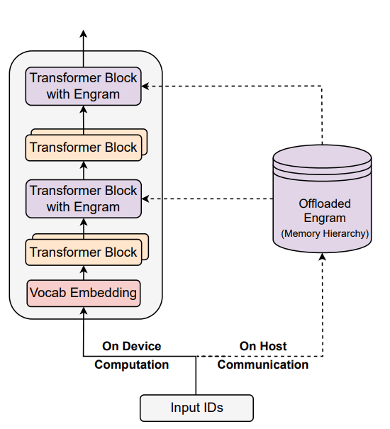 Engram将“查算分离”落到实处的做法,就是把大模型里的“计算”和“超大规模记忆”解耦,Transformer的算子全部在GPU/加速卡上计算,而庞大的Engram Embedding表放在CPU内存或高速存储设备上存查。如图1所示,GPU与CPU分工合作并通过异步方式协同,GPU执行前一步计算的同时,CPU可提前预取后续计算所需的N-gram Embedding表,当计算执行到“Transformer Block with Engram”时,所需的静态知识已经就位。