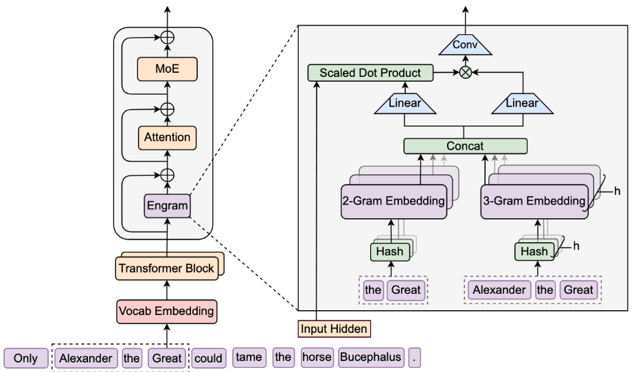 - N-gram哈希检索阶段:模块对输入序列提取2-gram、3-gram等不同子序列(如图中的“the Great”、“Alexander the Great”),每个子序列对应其阶数的多头哈希机制,从预构建的静态N-gram 嵌入表(如图中的2-Gram Embedding、3-Gram Embedding表)中以O (1)复杂度查询对应嵌入。