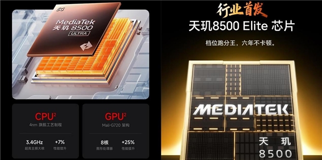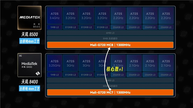 性能榜第八、九名则是联发科新中端芯片天玑8500的主场,这芯片虽作为天玑8400的升级款,但鲁Sir只能说它有些“挤牙膏”,与上代8400一样的台积电4nm工艺,同为1+3+4组合的全A725大核设计,也就是核心频率,分别从3.25GHz/3GHz/2.1GHz微微提高到了3.4GHz/3.2GHz/2.2GHz,CPU二级、三级、SLC系统缓存并没有上涨;GPU处理器则是沿用上代Mali-G720,升级的地方只多了一颗核心。
