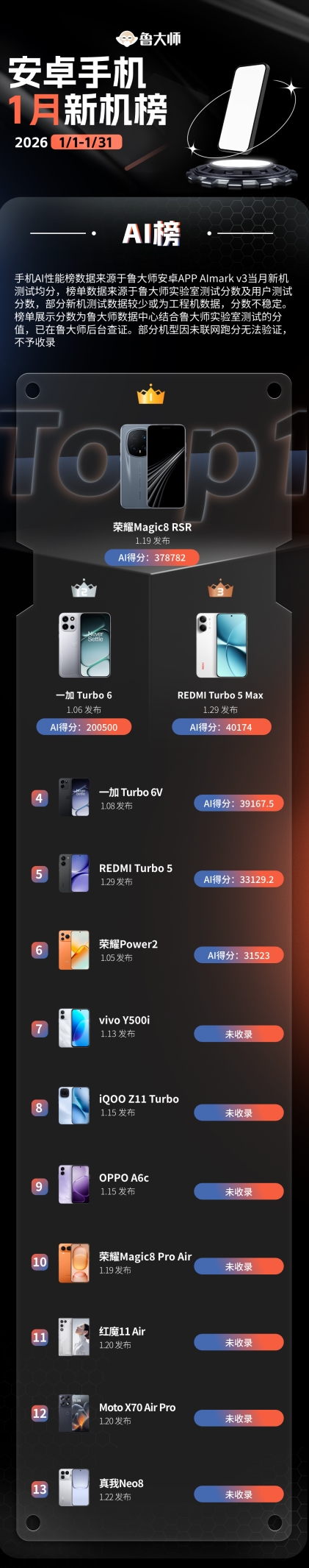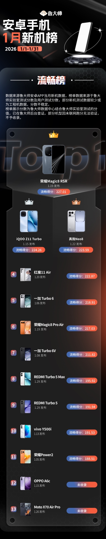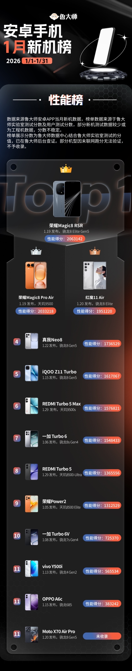 本月,荣耀亮相了自家顶级旗舰Magic8 RSR,同时还有与红魔、Moto各自端出的“Air”新机;此外荣耀、一加、真我、iQOO、红米还在中端机上发力,分别发布了荣耀Power2、一加 Turbo 6系列、真我Neo8、iQOO Z11 Turbo、REDMI Turbo 5系列;较为入门的机型,O、v两家则有新成员加入。接下来,鲁大师就带大家深入解析,在2026年首月机圈“考试”中,哪些机型在性能、流畅和AI维度脱颖而出?
