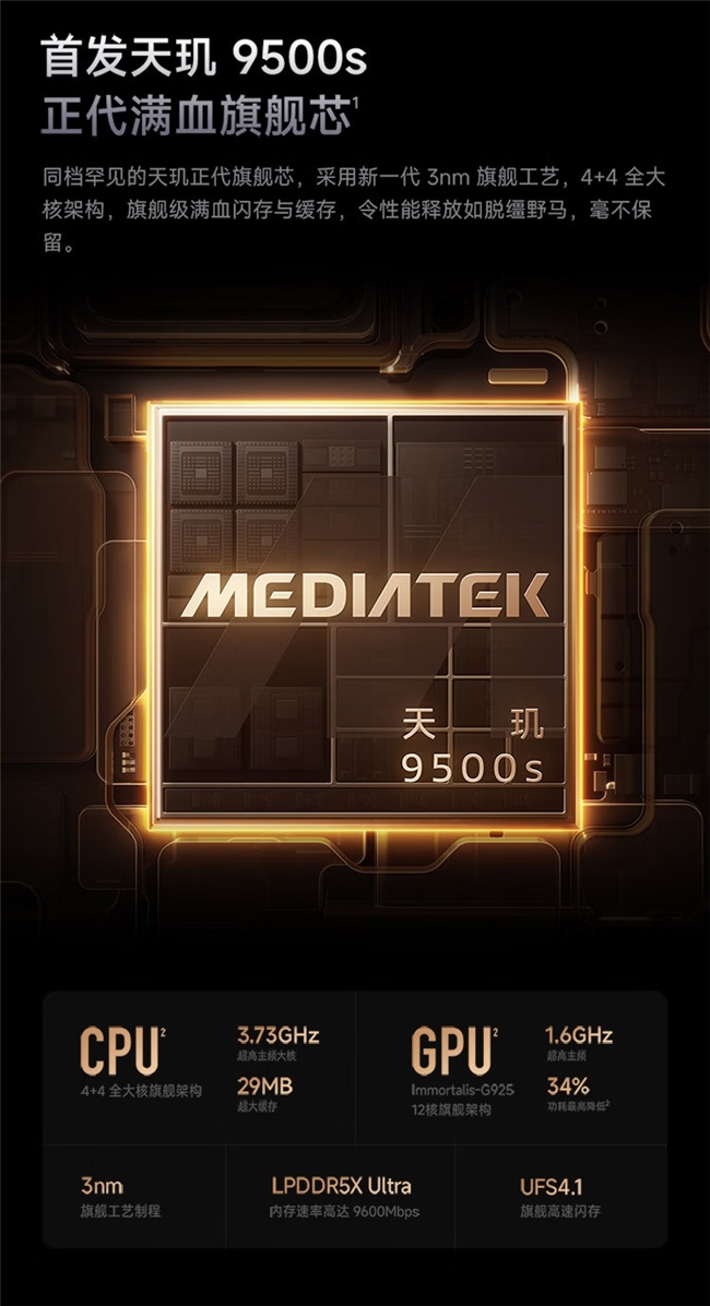 性能榜第六名REDMI Turbo 5 Max,搭载的则是来自联发科阵营的次旗舰芯天玑9500s芯片,至于这颗芯片的来历,可以简单把9500s理解为套了身皮肤的9400+,CPU组合同为1×X925超大核(3.73GHz)+3×X4超大核(3.3GHz)+4×A720大核(2.4GHz),同时GPU也是Immortalis-G925 MC12,频率1.61GHz,两芯片完全一模一样。不过9500s还有11核GPU的版本,REDMI Turbo 5 Max这里是上的12核GPU满血版,也就是说相当于搭载联发科上代旗舰芯片,最终REDMI Turbo 5 Max跑出了1576821分数,跑分不敌搭载8 Gen5的新机,看来红米对9500s的性能调校还差点意思啊?