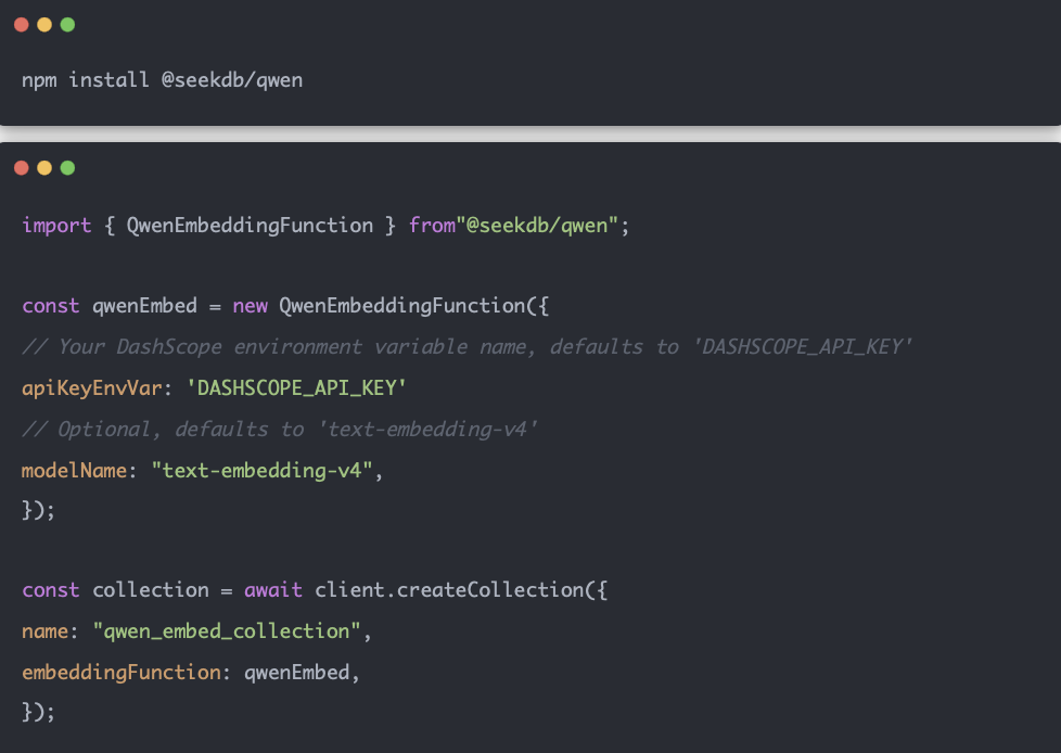 seekdb-js 这个 SDK 支持多种 Embedding 方式,可以选择在本地或云端生成向量。