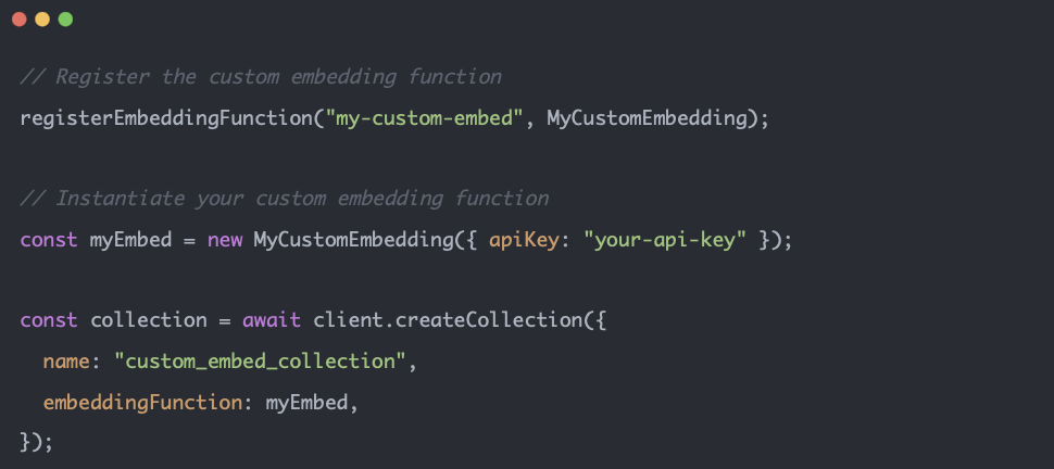 实验性 API:这些registerEmbeddingFunctionAPIgetEmbeddingFunction目前处于实验阶段,未来版本可能会有所更改。