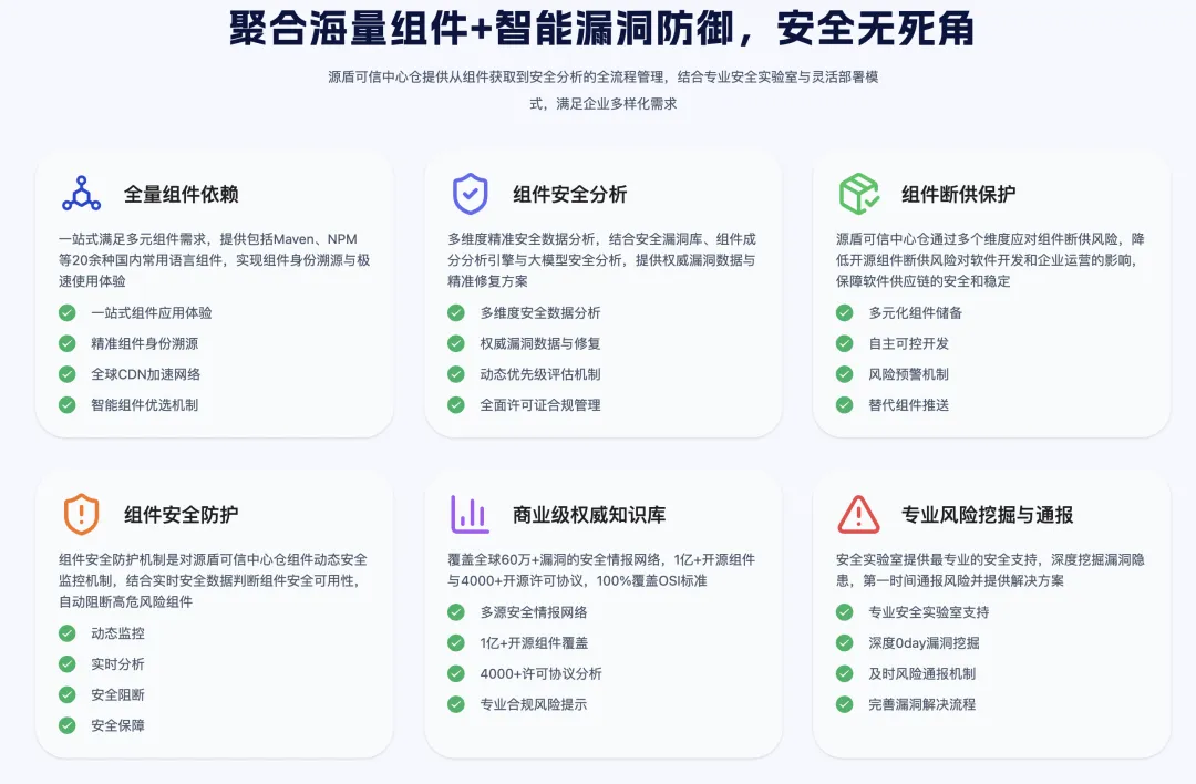 源盾可信中心仓则提供了一站式的全语言开源组件服务,支持 Maven、Npm、Docker、Go、Pypi、Nuget 等二十余种主流语言体系,覆盖企业研发所需的基础依赖。平台支持组件溯源、数字签名校验与 CDN 加速,并基于元数据与场景标签构建推荐机制,帮助开发者高效选择可信组件。所有组件均遵循严格准入规范,经过安全检测和合规审查,确保「拉取即可信、使用有保障」。