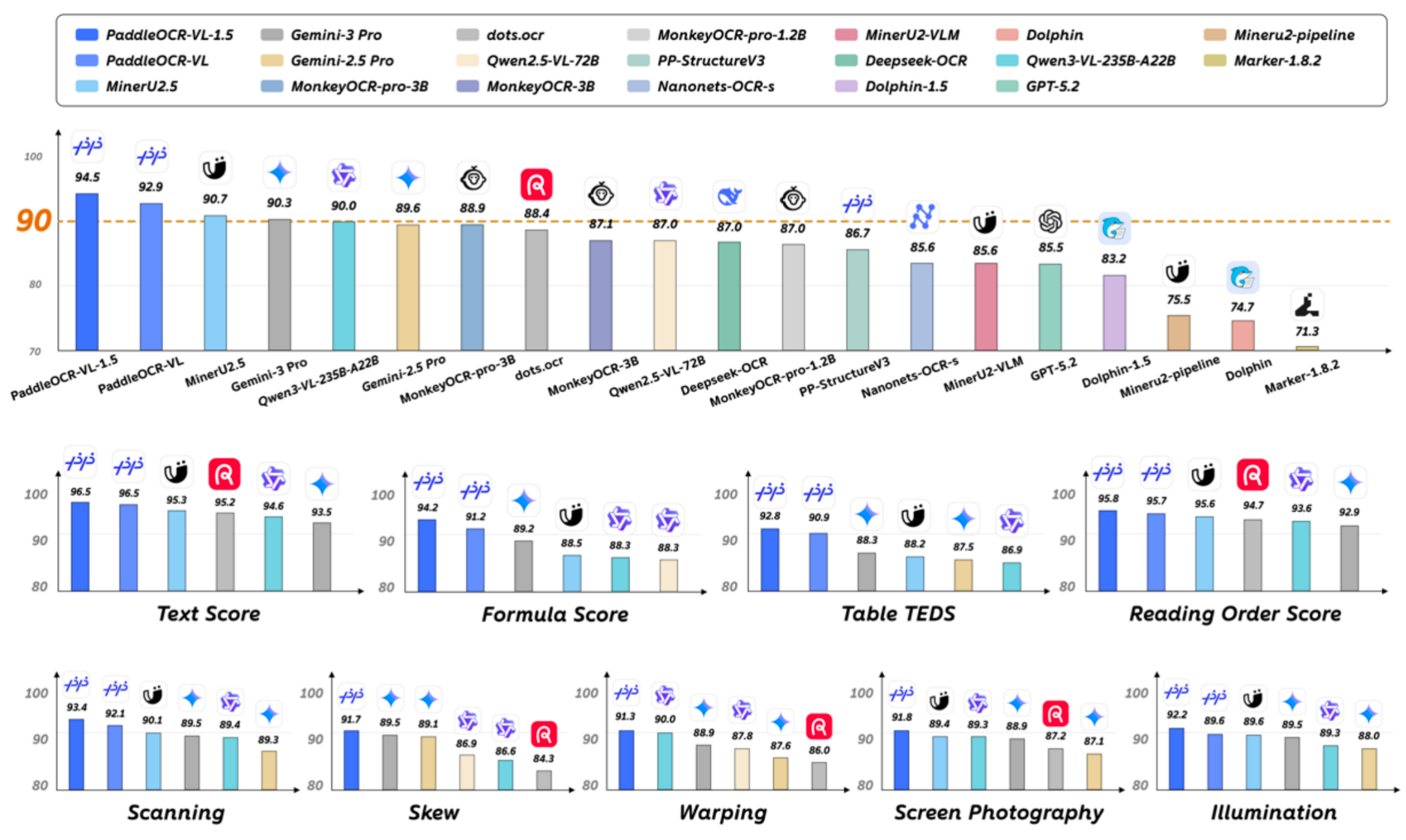 PaddleOCR-VL-1.5 基于文心大模型进行开发,在 OmniDocBench V1.5多个关键指标上取得领先表现。其中,表格结构理解(92.8 分)和阅读顺序预测(95.8 分)两项核心指标上均位列第一,分别领先 Gemini-3-Pro、DeepSeek-OCR 等主流模型 2–5 分不等。在文档阅读顺序预测任务中,其版面逻辑解析错误率仅为同类其他模型约一半。这表明,PaddleOCR-VL-1.5 在复杂文档结构还原与版面逻辑理解方面具备更高稳定性,在合同、财报等高复杂度业务场景中拥有更高可用性。